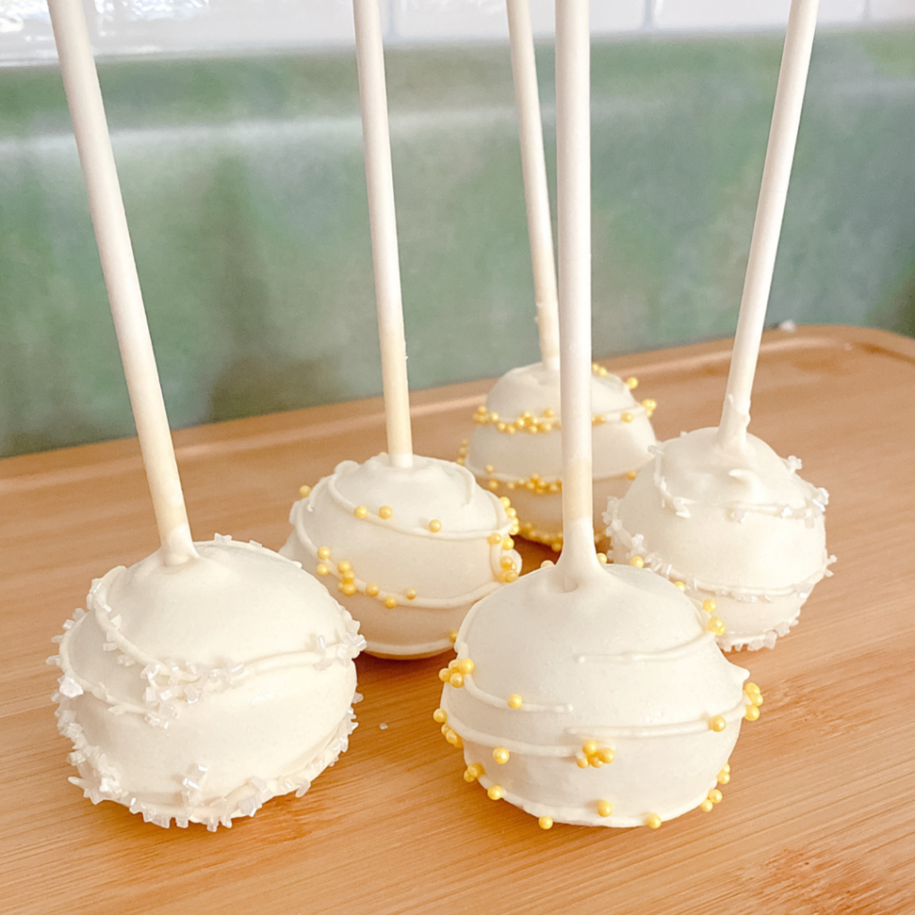 - Drizzle vanilla chocolate over cake pops using a piping bag or ziplock bag